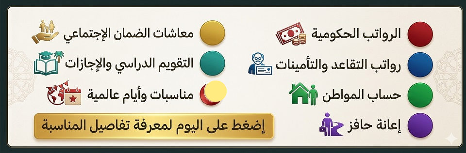 التقويم الهجري وما يوافقه بالميلادي متضمناً المناسبات المحلية والعالمية ومواعيد الرواتب السعودية والتقويم الدراسي